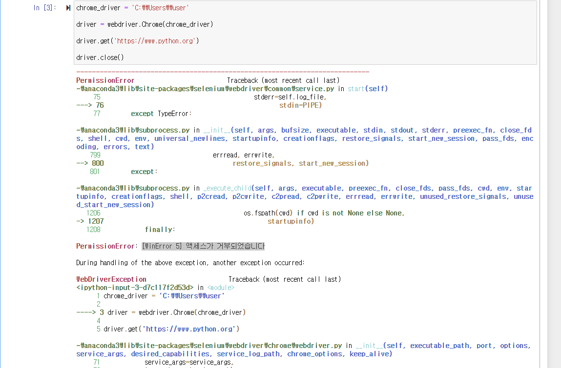 나의 경우에는 chrome_driver = "C:\\Users\\user\\chormedriver"라고 올바를 주소로 정정하는 순간