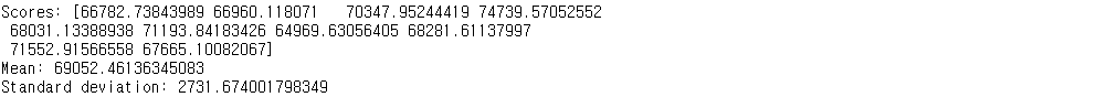 여기 사이킷런에서 K-겹 교차 검증(K-fold cross-validation) 기능을 제공하는 cross_val_score 함수가 있다. 해당 함수에 사용하고자 하는 모델의 객체, 훈련 데이터 세트, 데이터 레이블, 평가 방법과 서브셋 개수를 파라미터로 지정해준다. 위 코드에서는 훈련 세트를 폴드(fold)라고 불리는 10개의 서브셋으로 무작위로 분할하여 선형 회귀 모델을 10번 훈련하고 평가한다. 매번 다른 폴드를 선택해 평가에 사용하고 나머지 9개 폴드는 훈련에 사용하므로 총 10개의 평가 점수가 담긴 배열이 결과로 출력된다. 출력 결과는 다음과 같다.