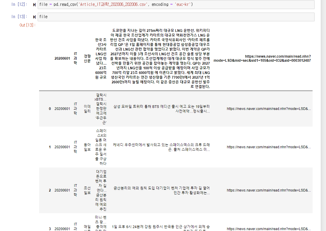 pd.read_csv()함수 안에 encoding = 'euc-kr' 코드를 추가해준 결과 에러가 발생하지 않고 정상적으로 작동하는 것을 알 수 있다.