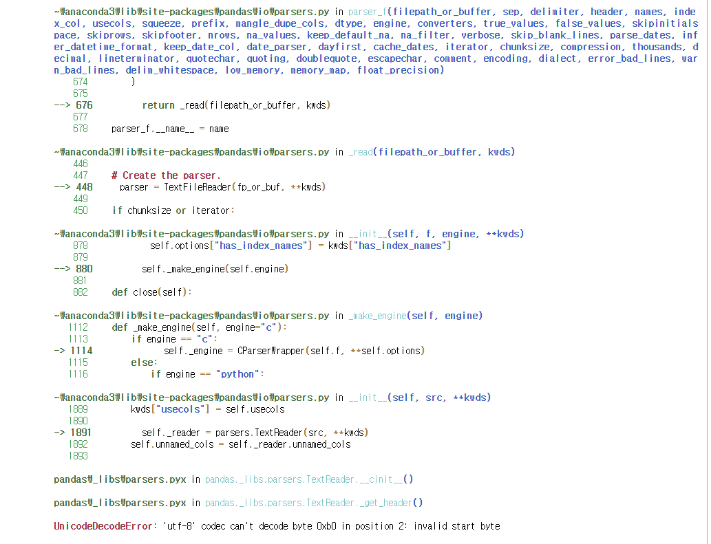 이런 경우, pd.read_csv()함수 안에 단지 파일명만 파라미터로 주는 것이 아니라 encoding이라는 파라미터를 추가하여