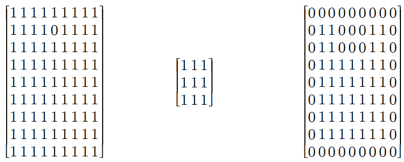 침식(erosion)은 기존에 있던 영역을 깎는 것이다. 침식 연산의 구조화 요소 커널이 해당 픽셀에 온전히 적용되지 않으면 그 픽셀을 없애버린다는 것이다. 행렬로 표현하면 다음과 같이 나타낼 수 있다.