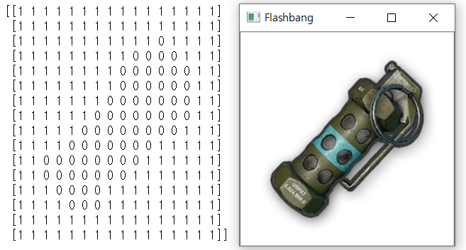 코드를 실행한 결과 0과 1이 배열된 것을 보면 0으로 구성된 모양이 섬광탄 형태와 유사함을 확인할 수 있다. 이렇게 얻은 평균 해시를 다른 이미지와 비교해서 얼마나 유사한지 측정해야 하는데, 유클리드 거리와 해밍 거리를 사용해서 측정한다.