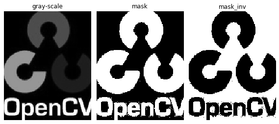 먼저 로고 이미지를 흑백으로 변환하고 이를 binary image로 전환한다. 이때 threshold 함수가 사용되는데 이에 대해서는 나중에 자세하게 다룰 예정이다. 간단하게 설명하면, img2gray 이미지에서 픽셀값이 10이상 넘어가는 부분을 255(흰색)으로 바꿔주는 부분이다. 그리고 해당 이미지를 mask에 저장한다. 비트연산 NOT을 이용해 이를 반전시켜 mask_inv에 저장한다. 즉, mask_inv에서는 mask에서 흰색인 부분이 검은색으로 저장된다.