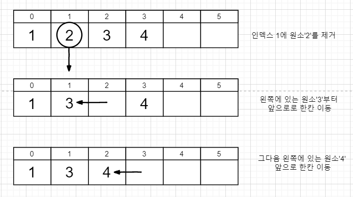 배열 리스트에서 중간에 있는 원소를 제거하면 중간에 발생한 공백을 지우기 위해서 뒤에 있는 원소들이 한칸씩 앞으로 이동해야한다. 그림을 통해 알아보자