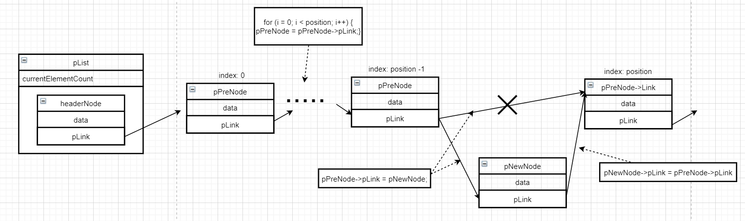 배열 리스트에서의 원소 추가와 마찬가지로 pList!= NULL인지 체크하고 새로 노드를 추가하려는 위치가 적합한지 체크한다. 확인되면 pNewNode에 메모리를 할당하고 입력받은 원소로 값을 준다. 그 후에는 링크 재설정을 위해 새로운 원소를 넣을 위치 한 단계 앞에 있는 노드(인덱스 position-1에 위치한 노드)를 찾아야 한다. 따라서 pPreNode를 시작 값인 hederNode값으로 초기화해주고 for 문을 이용하여 pPreNode를 인덱스 position-1에 위치한 노드까지 이동시킨다.