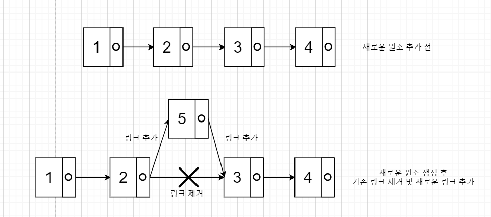 연결 리스트는 자료들끼리 붙어있어야 한다는 물리적 제약이 없기 때문에 그냥 새로운 원소를 생성하고 포인터를 이용해 연결만 잘해주면 된다.