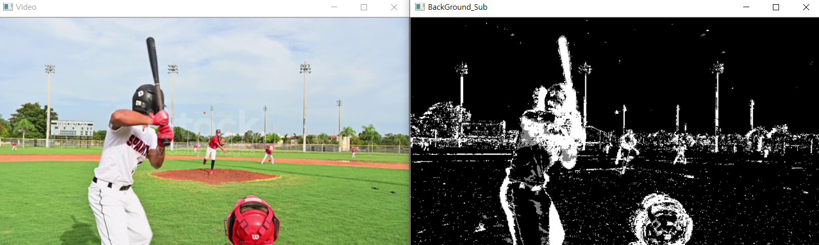 배경 제거 객체 생성 함수로는 cv2.createBackgroundSubtractorMOG2()를 사용한다. cv2.BackgroundSubtractor에 포함된 apply함수는 입력 영상,[출력 결과, 배경 훈련 속도]를 인자로 사용한다. 배경 훈련 속도는 -1이 default값으로 설정되며, 0부터 1사이의 값을 설정해서 배경 훈련 속도를 조정할 수 있다. 0은 배경 모델이 업데이트되지 않았다는 것을, 1은 배경 모델이 마지막 프레임에서 초기화되었음을 의미한다.