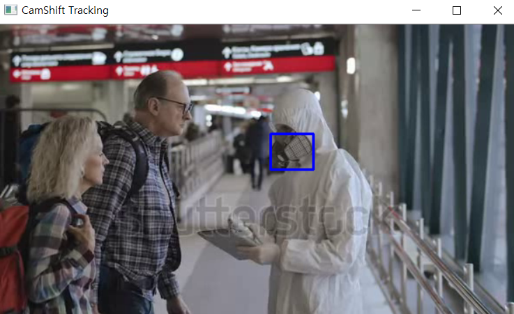 cv2.meanShift() 함수는 검색할 히스토그램의 역투영 영상, 검색 시작 위치, 검색 중지 요건을 인자로 사용한다. 위 코드에서의 검색 시작 위치는 ROI를 설정한 좌표로 지정된다. 검색 중지 요건으로 사용된 변수 terminal은 (검색을 중지할 경우, 최대 반복 횟수, 최소 정확도)의 튜플 형태로 전달되어야 한다. terminal에서 사용된 cv2.TERM_CRITERIA_EPS는 정확도가 epsilon보다 작을 경우를, cv2.TERM_CRITERIA_COUNT는 최대 반복 횟수와 동일한 경우를 의미한다. meanshift의 경우 color space를 기반으로 이루어지기 때문에 추적할 객체의 색상이 주변과 유사한 경우에는 큰 효과를 보기 어려운 단점이 있다.