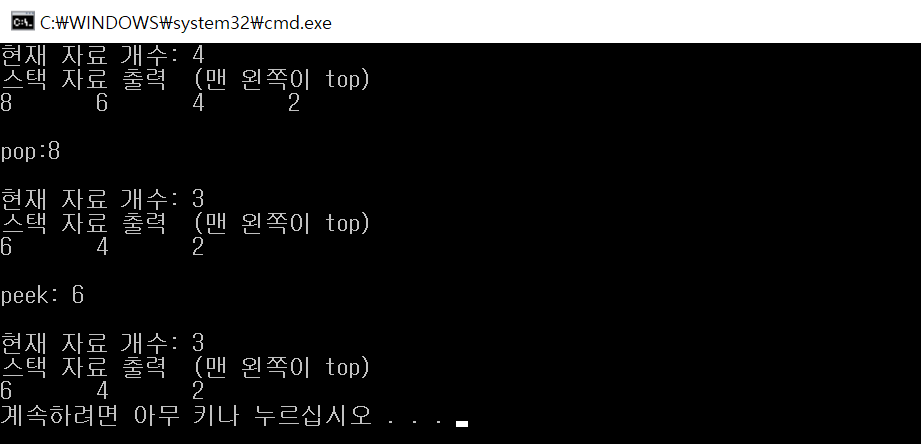 cout << "스택 자료 출력 " << "(맨 왼쪽이 top)" << endl;