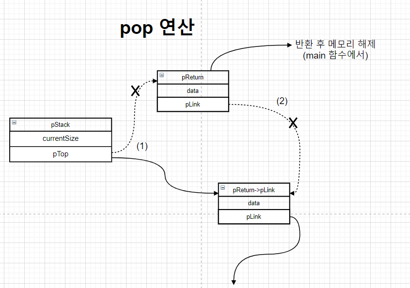 pStack->pTop = pReturn->pLink;// 1) pTop과 새로운 탑 노드와 연결