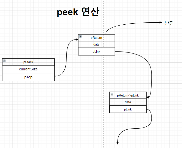 peek 연산은 pop연산과 거의 비슷하다. 차이점은 반환되는 노드가 제거되지 않기 때문에 링크를 재설정할 필요도 없고 반환되는 노드에 대해 메모리 해제도 해주지 않아도 된다.