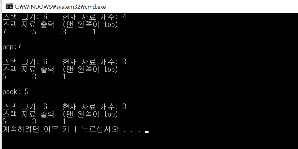 cout << "스택 자료 출력 " << "(맨 왼쪽이 top)" << endl;