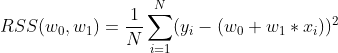 식을 보면, 여러가지 문자들이 많이 나와있다. (w_0, w_1, N, y_i, x_i) 이 때문에 이 식이 어렵고 복잡하게 느껴질 수 있지만, 선형 회귀에서 최종적으로 찾아내야 하는 값이 w_0, w_1을 제외한 모든 값들을 데이터의 입력을 통해 받은 정보라는 사실이다.