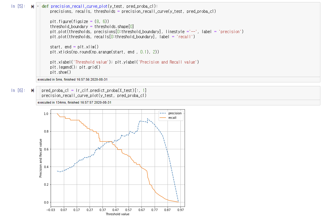 함수를 정의하고 실행한 결과 재현율의 성능이 약 60%로 다른 평가 지표보다 낮다. 이런 경우, 정밀도 재현율 곡선을 보고 임계값을 조절하여 지표를 조절할 수 있다. 그러기 위해서 정밀도 재현율 곡선을 시각화하는 함수(precision_recall_curve_plot)를 정의한다.