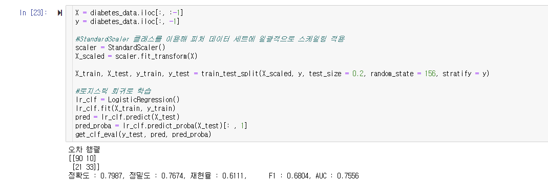 데이터를 다운받은 다음 성능 지표들을 임포트하고, 정규화(StandardScaler) , 로지스틱 회귀 모델을 사용할 수 있는 LogisticRegression 클래스를 임포트한다. (Numpy, Pandas, Matplotlib.pyplot은 지난 포스팅과 동일하므로 생략)