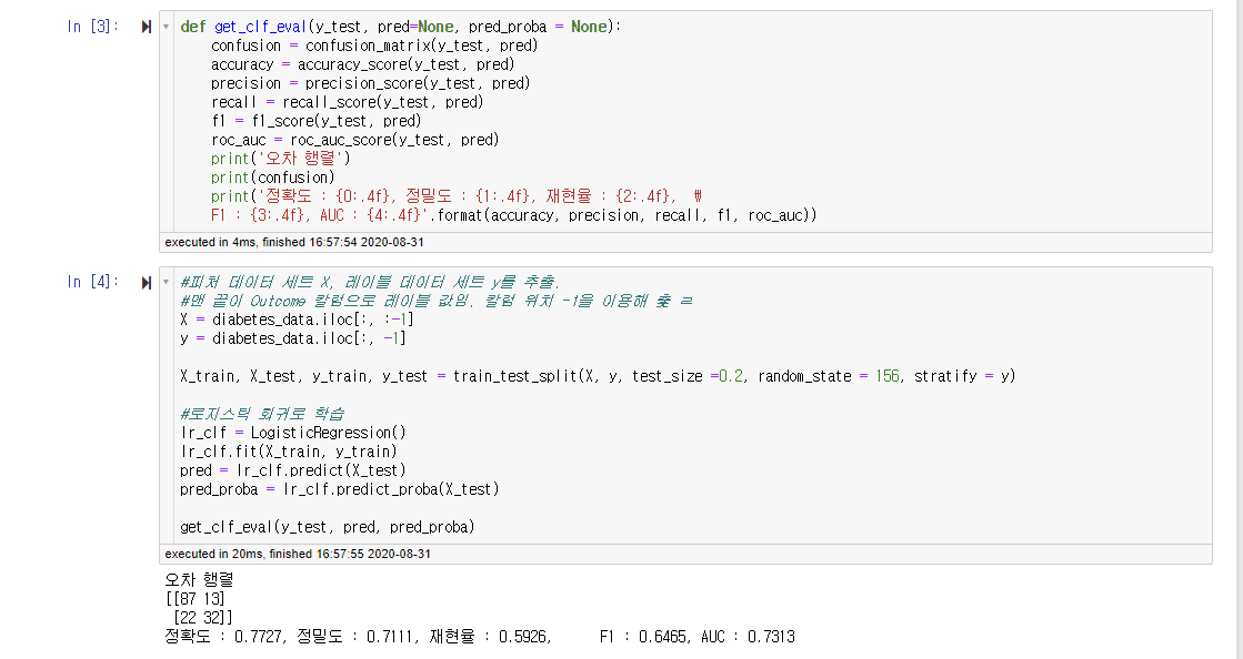 get_clf_eval이라는 분류기 성능을 측정하는 함수를 정의한다. 이 함수는 정확도, 재현율, 정밀도, f1 Score, ROC_AUC Score을 측정하여 출력하는 함수이다.