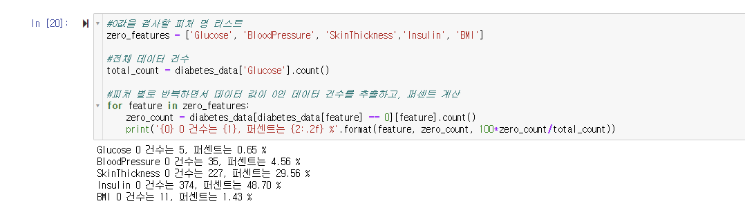 print('{0} 0 건수는 {1}, 퍼센트는 {2:.2f} %'.format(feature, zero_count, 100*zero_count/total_count))