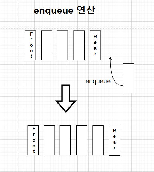 스택에서는 스택의 특성 때문에 모든 연산이 스택의 제일 위(Top)에서 일어난다. 큐에서는 자료를 추가할 때는 뒤에서 추가하고 자료를 반환할 때는 앞에서 자료를 빼가기 때문에 스택보다 좀 더 생각해야 하는 부분이 많아진다. 큐에서는 맨 앞에 있는 자료를 프런트(front)라고 하며 맨 끝에 있는 자료를 리어(rear)라고 한다. 따라서 큐에서의 연산은 front와 rear를 어떻게 설정해줘야 할지 잘 생각해야 한다.