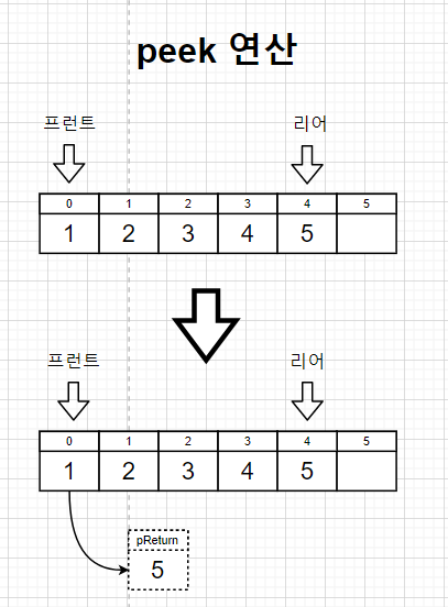 피크 연산은 front 값을 변경 시켜줄 필요가 없기 때문에 배열 큐에서의 피크 연산과 구현 코드가 동일하다.