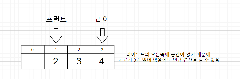 마지막에 새로운 노드 '5'를 추가했으나 배열 큐느 큐에 빈 공간이 있지만(위치 인덱스 0) 인식하지 못하기 때문에 인큐 연산을 실패한 모습이다.