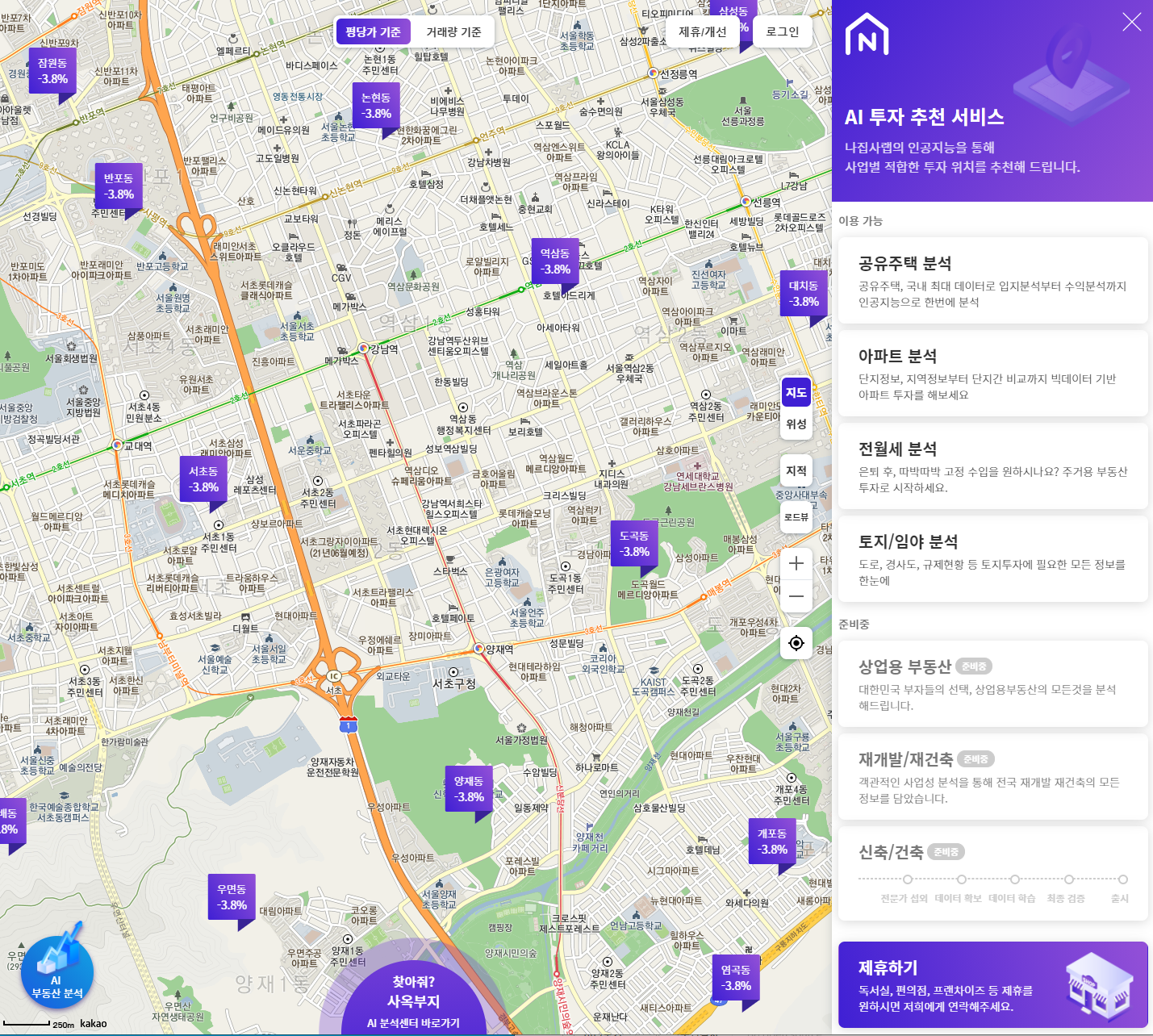 쉐어킴 안에서 자체적으로 개발한 AI 투자 추천 서비스인데, 빅데이터 기반 최적의 입지를 선정해준다. 이런 분석들이 신규 사업가를 추천해주는 서비스 뿐만 아니라, 셰어킴 내부에서도 입지에 따른 최적의 하우스를 선별해낼 수 있을 것 같다.