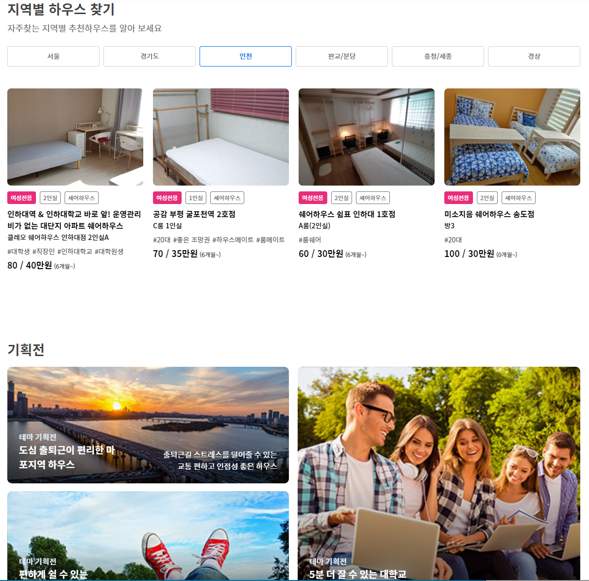 기획전 - '도심 출퇴근, 편하게 쉴 수 있는, 대학교에 가까운' 이렇게 테마에 맞는 하우스들을 한 곳에 합쳐놓았다. 이 점이 내가 원하는 요소들을 한 곳에 볼 수 있기 때문에 굉장히 좋은 것 같다.