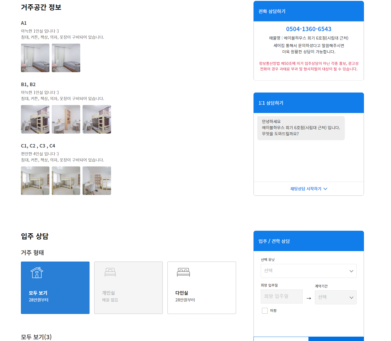 방 선택 -> 희망 입주일과 계약기간 선택 -> 개인정보(이름, 번호, 나이) 입력 -> 상담 신청서 발송이다.