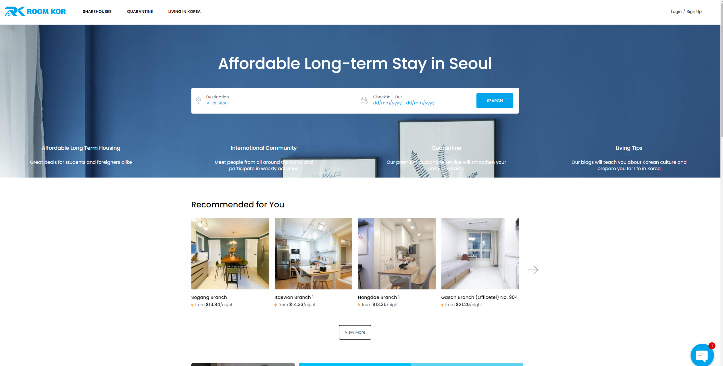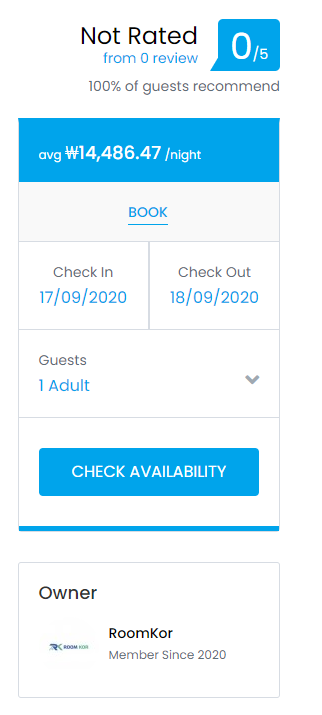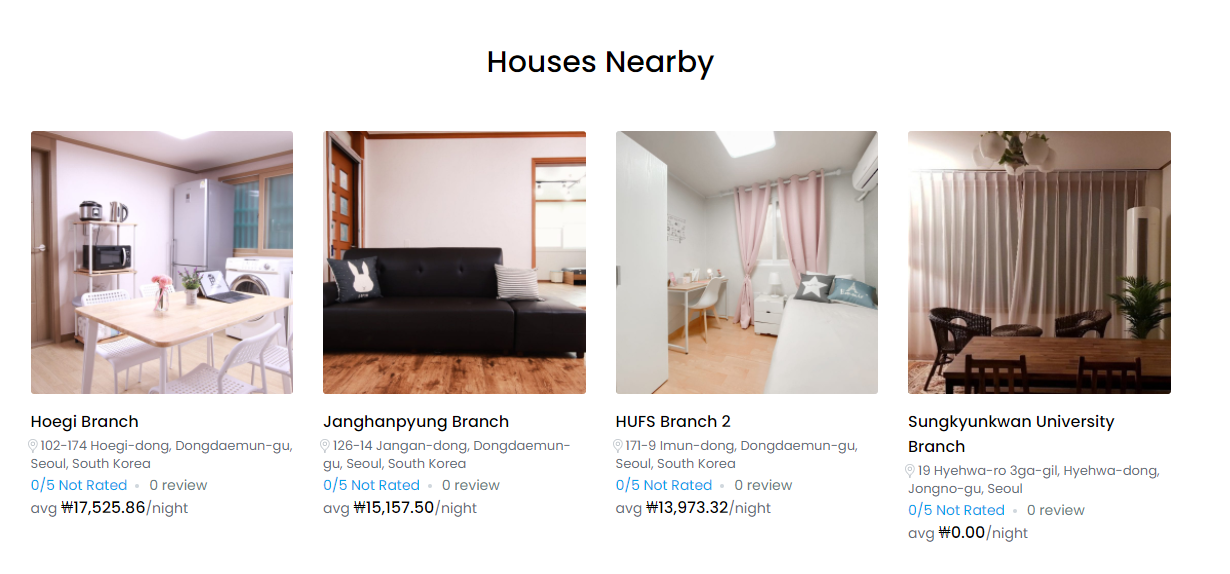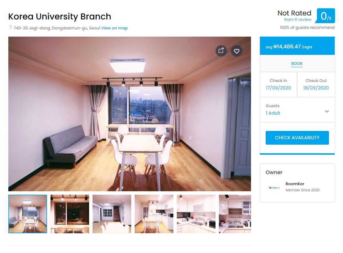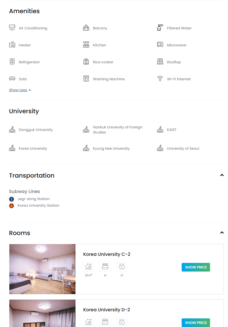 국내 숙박업소 플랫폼과 다르게 Destination과 check in-out이 첫 검색화면에 나와 있어서 좋은 것 같다. 외국인들은 숙박업소를 찾을 때, 지역보다는 목적지(대학교)와 거주 기간을 제일 중요시 여기기 때문이다.