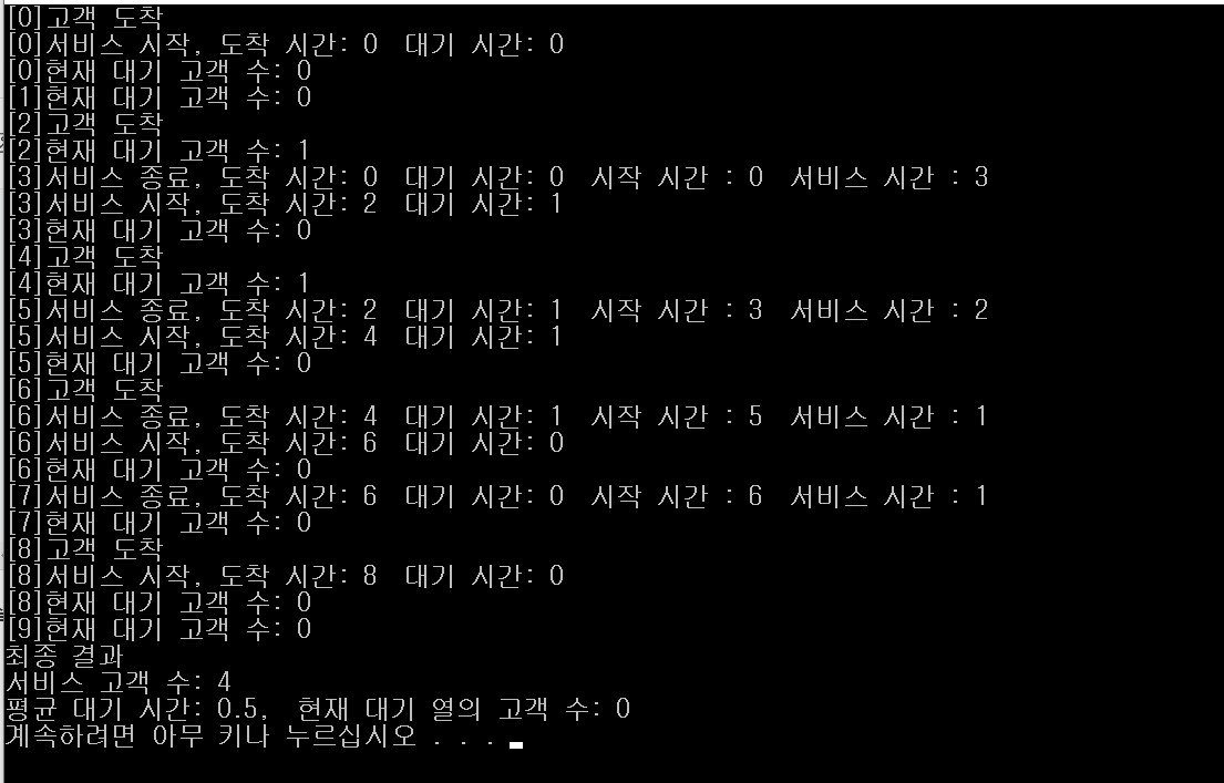 위 작업이 모두 끝나면 전체 결과를 출력하고 메모리 해제를 해준다. 이때 전체 결과는 처리한 고객 수, 평균 대기 시간, 현재 대기열의 고객 수가 있다.