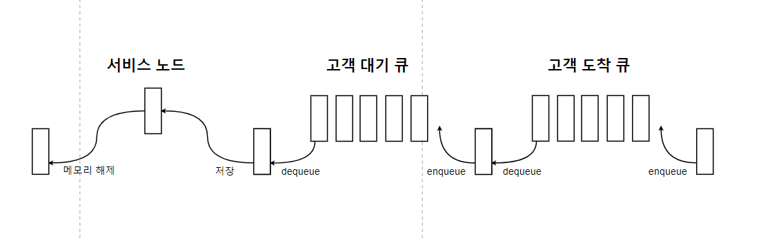 - 서비스 노드: 서비스 노드에서는 고객이 정해진 시간만큼 서비스를 받는다. 그래서 매 시각 서비스가 종료되었는지 점검한다. 만약 서비스가 종료되면 메모리 해제를 하고 다음 서비스를 받을 노드를 고객 대기 큐에서 받아온다.