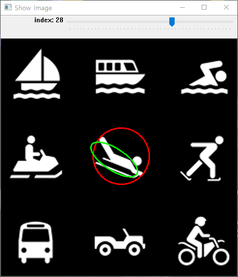 직사각형에서 했던 것과 마찬가지로 이미지의 각 Contour가 가지는 원과 타원을 Trackbar를 이동해보면서 확인해볼 수 있는 코드를 작성해보았다. 모든 Contour의 point를 가지는 가장 작은 원은 빨간색으로, 타원은 초록색으로 표시했다.