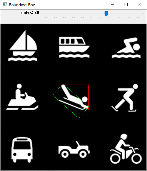 이미지를 가져와 각 Contour에서 만들어 질 수 있는 Straight Bounding Rectangle와 Rotated Rectangle를 확인해볼 수 있다. img 변수로 초기화된 사진을 변경시킬 수 있어 내가 원하는 사진을 이용해 어떤 Contour를 가지는지 확인해 볼 수 있고, Trackbar를 이용해 Contour를 이동시켜가면서 각 Contour가 가지는 bounding box를 빨간색으로는 Straight, 초록색으로는 Rotated된 형태로 표현해보았다.