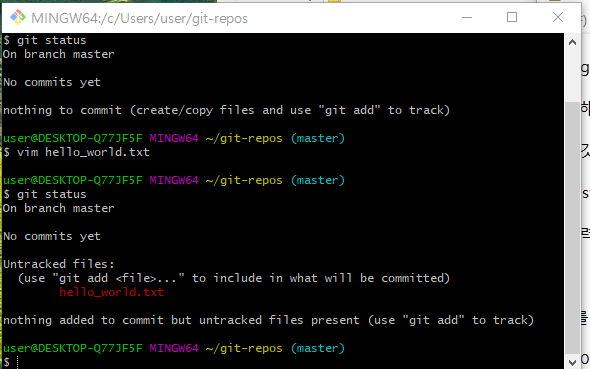 를 입력해서 확인을 하면, 작성한 hello_world.txt 파일이 Untracked files로 되어있는 것을 확인할 수 있다.
