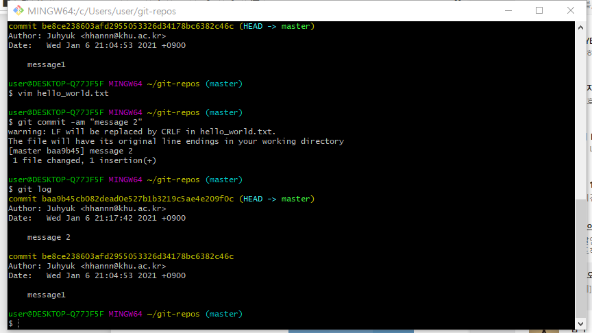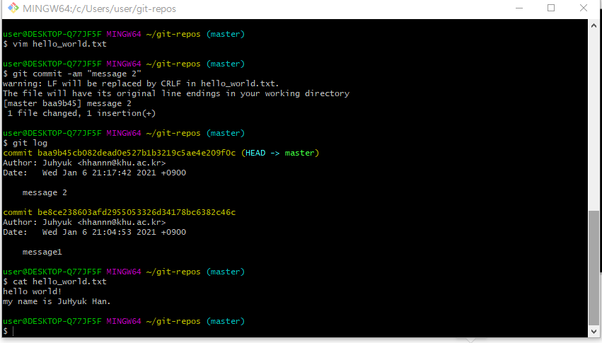 현재 사용하고 있는 git bash 라는 프로그램은 리눅스를 기반으로 하고 있다. 그리고 지금 필자 혹은 대다수의 여러분이 사용하고 있는 컴퓨터는 Windows를 운영체제로 하고 있을 것이다. Windows는 Enter키를 입력하게 되면 (이것을 개행문자라고 한다.) CRLF가 입력이 되는데, Mac이나 Linux에서는 Enter를 입력한 경우 CR만 입력이 된다. 이것은 깃에서 자동으로 CRLF의 개행문자를 CR로 변환한다는 의미이다. 별도의 조치를 취할 사항은 없다.