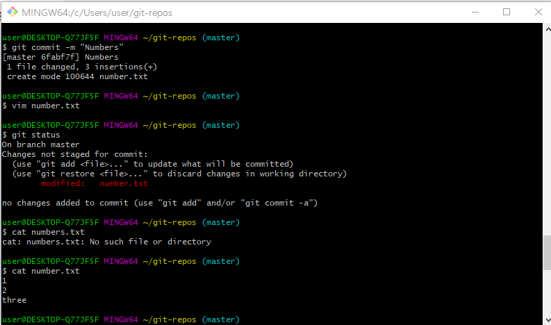 vim을 통해 다시 number.txt에서 3을 three로 수정한 뒤 git status를 통해 현재 깃의 상태를 확인한다.