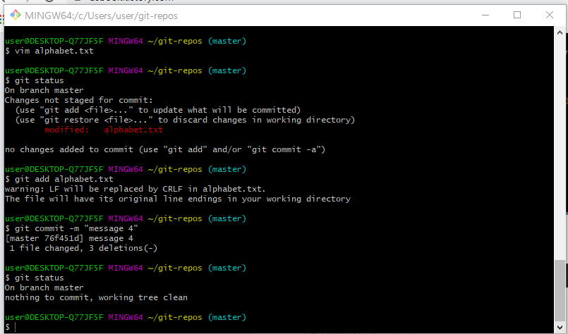 $ git log를 보면 "message 4" 가 "delete b, c, d"가 되어있는 것을 확인할 수 있다.