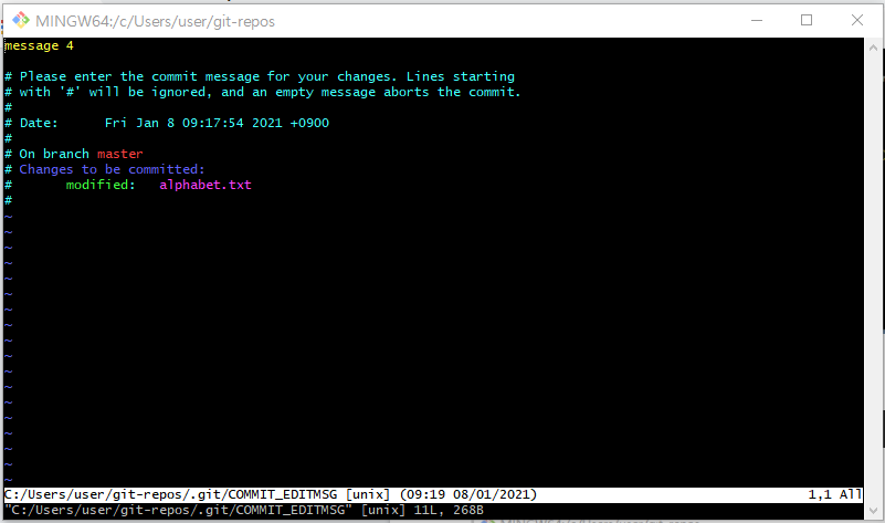 를 입력하고 위에 있는 이전에 커밋 메세지의 내용을 vim에서 수정할 때와 마찬가지로 i를 눌러 수정하고
