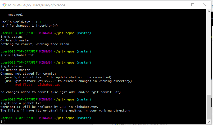 이전에 커밋을 한 적이 있는 hello_world.txt파일은 'Changes not staged for commit'이라는 표현 아래 적혀있고, 이전에 커밋을 한 적이 없던 alphabet.txt파일은 Untracked files라고 적혀있다.