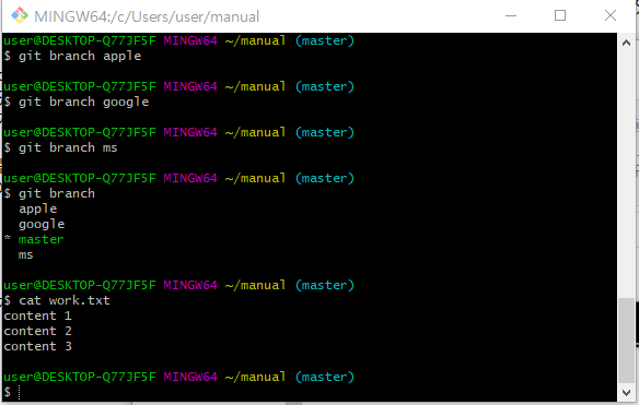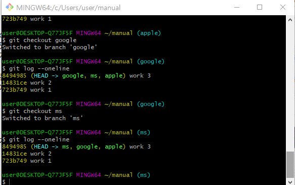 위의 사진을 보면 마스터 브랜치만 master content 4를 가리키고 이전에 만들었던 브랜치 3개(apple, google, ms)는