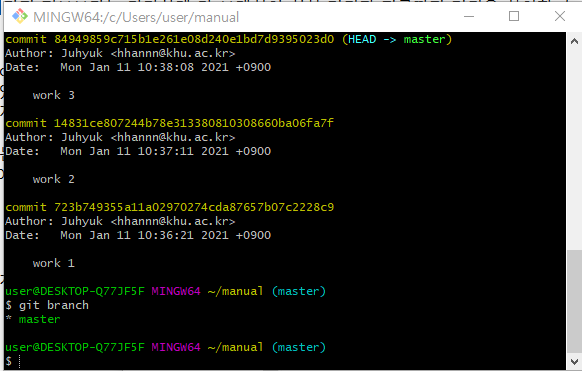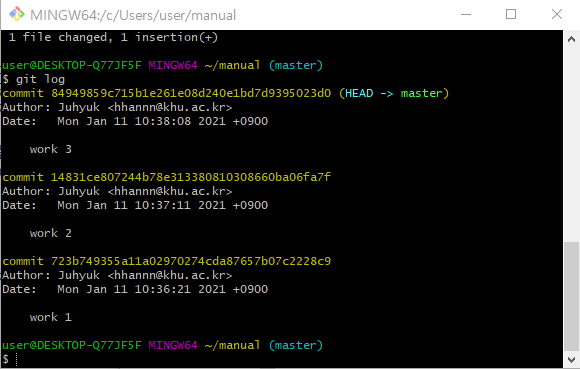 이렇게 3개의 버전을 커밋한 뒤 git log를 통해서 커밋한 내용들을 보면