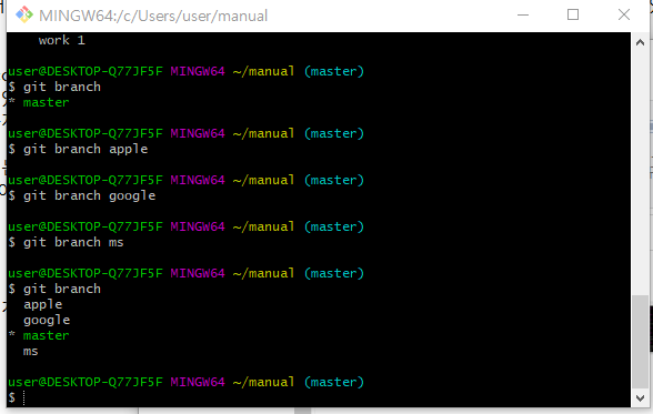 $ git branch <브랜치 명>을 통해서 브랜치를 새롭게 만들고 이름을 지정해 줄 수 있다. apple, google, ms 브랜치를 만들고 브랜치 목록을 확인한다.