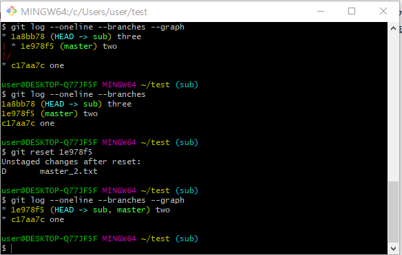 현재 HEAD 는 sub 브랜치에서 가장 최근에 커밋한 파일인 sub.txt를 가리키고 있다. 이것을 git reset <해시 값>을 통해서 master 브랜치의 master_2.txt를 가리키도록 만든다.