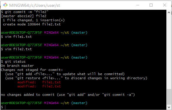 작업트리에 수정한 file1.txt 파일과 file2.txt 파일이 modified (tracked) 되어있는 것을 확인할 수 있다.