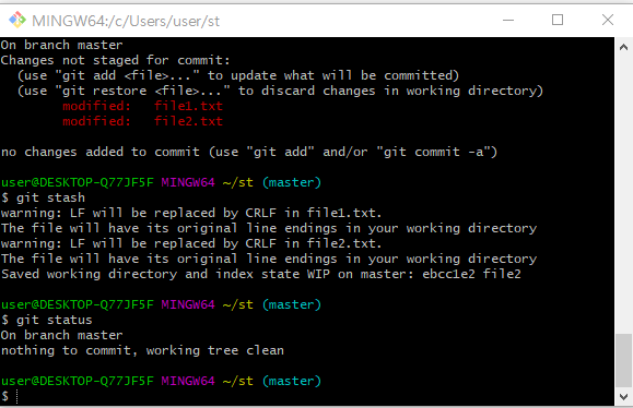 이후 file1.txt 파일과 file2.txt 파일을 11과 22로 수정한뒤 git status 명령어를 통해서 stash 명령어를 실행하기 위한 과정인 파일들이 tracked 인 상태인지 확인한다. 이후 stash 명령어를 사용하고, git status 명령어를 통해서 아직 남아있는지 확인한다.