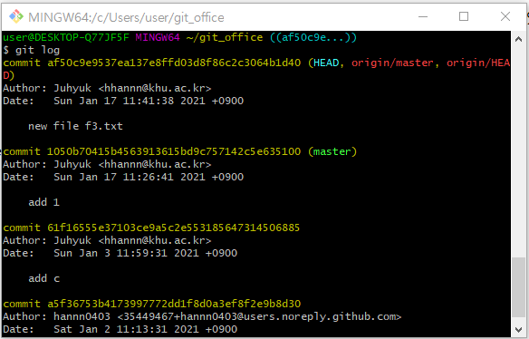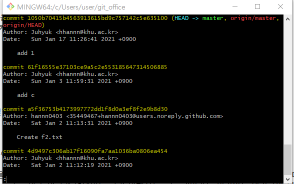 출력 결과를 통해서 현재 GitHub 페이지의 원격 저장소가 어느 커밋을 가리키고 있는지 확인할 수 있다. 확인 후 최신 커밋을 현재 git_office 브랜치에 병합하기 위해서는 다시 master 브랜치로 checkout 한 뒤에 merge 명령어를 통해서 병합할 수 있다.