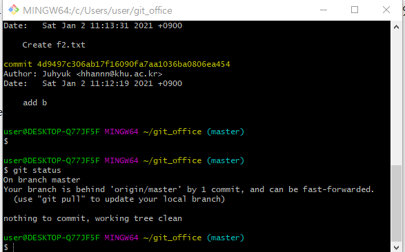 git_office를 만들고 나서 f1.txt 파일을 수정하였으므로, 수정된 커밋은 현재 git_office에 반영이 되어있지 않은 상태이다. git_office를 가장 최신의 GitHub Repository와 동일하게 업데이트 하기 위해서는 git pull이라는 명령어를 입력하면 된다.