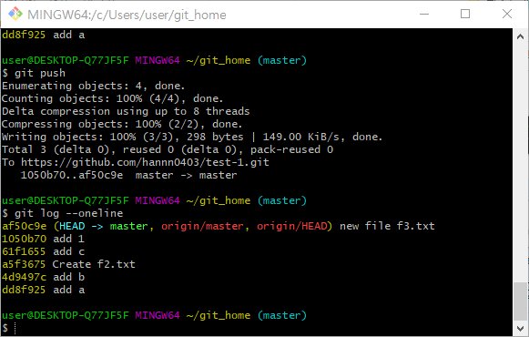 명령어를 입력해서 보면 지역 저장소는 "new file f3.txt"를 가리키고 origin은 하나 이전의 커밋을 가리키고 있는 것을 확인할 수 있다.