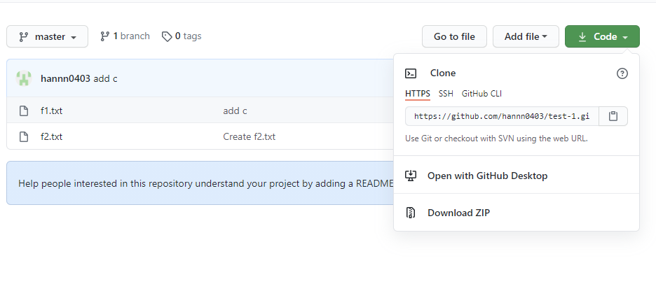 일단 지역 저장소에서 작업을 하기 위해서는 원격 저장소에 저장되어 있는 파일들을 가져와야 한다. 여기에서는 이전에 만들었던 GitHub의 test-1이라는 repository를 사용할 것이다.
