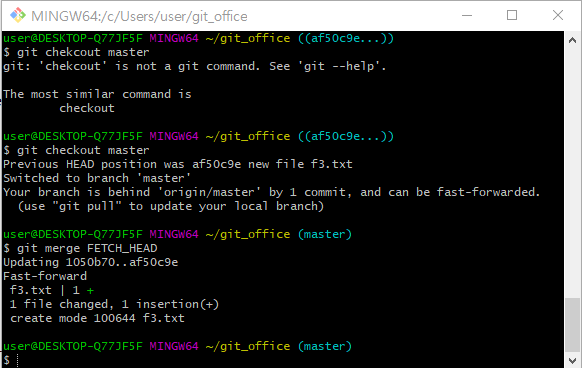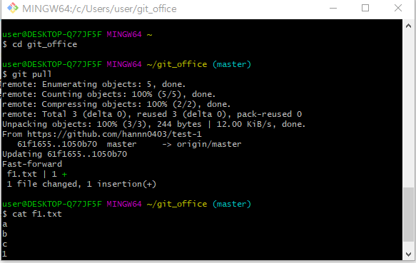 일단 git_office 디렉토리 안으로 들어가 git pull 명령어를 입력해본 후 f1.txt 파일이 변화했는지 확인해보자.