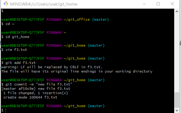 일단 git_home 디렉토리에서 f3.txt 파일을 생성하여 안에 A,B,C를 입력하고 커밋까지 완료한다.
